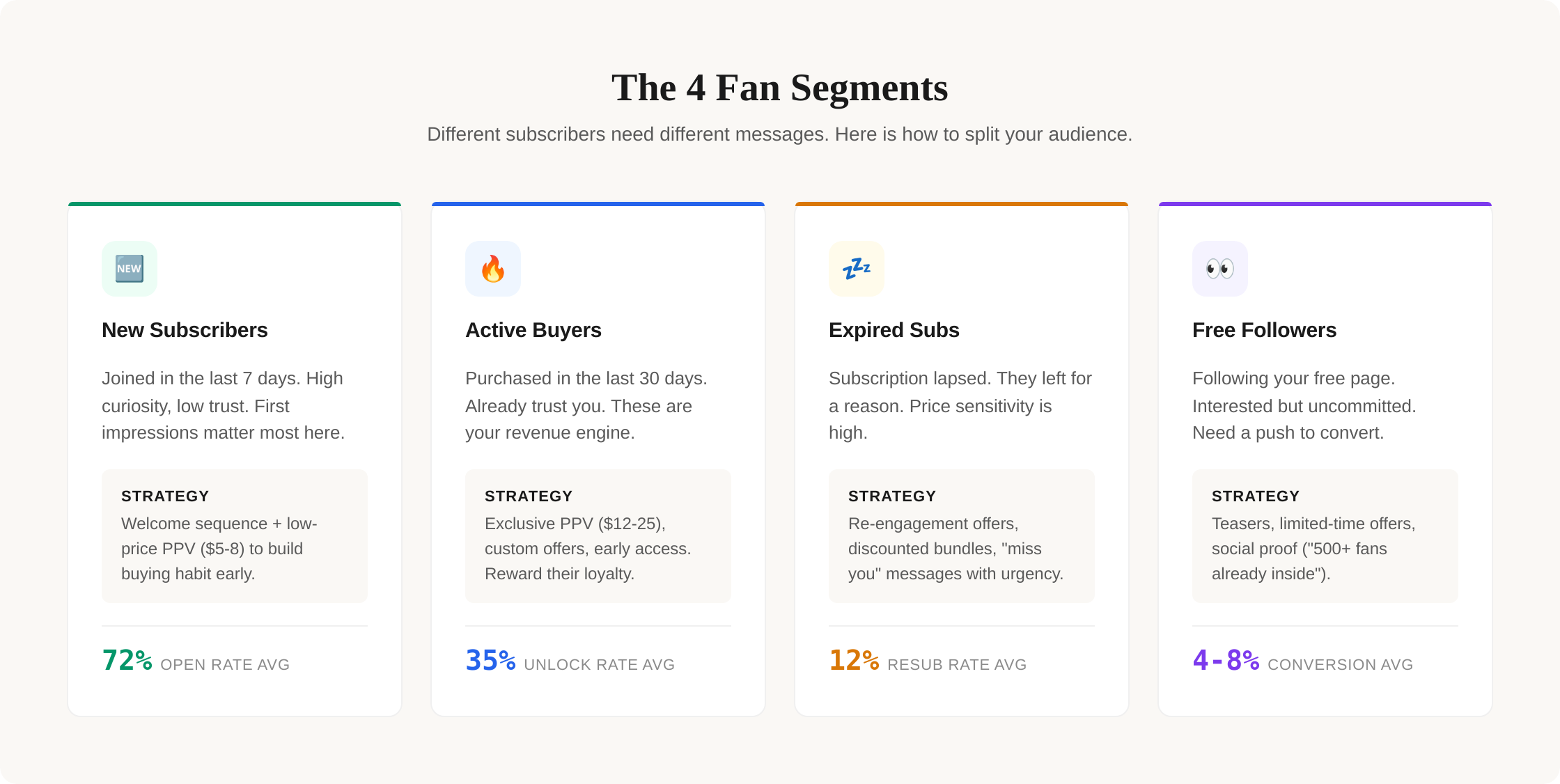 No, and this is probably the most expensive mistake we see creators make. New subs get a welcome sequence. Active fans get the 70/30 mix of engagement and PPV. Expired fans get re-engagement offers with incentives. Whale fans get exclusive access and first dibs on customs. One generic message for everyone is the fastest path to mediocre results.
