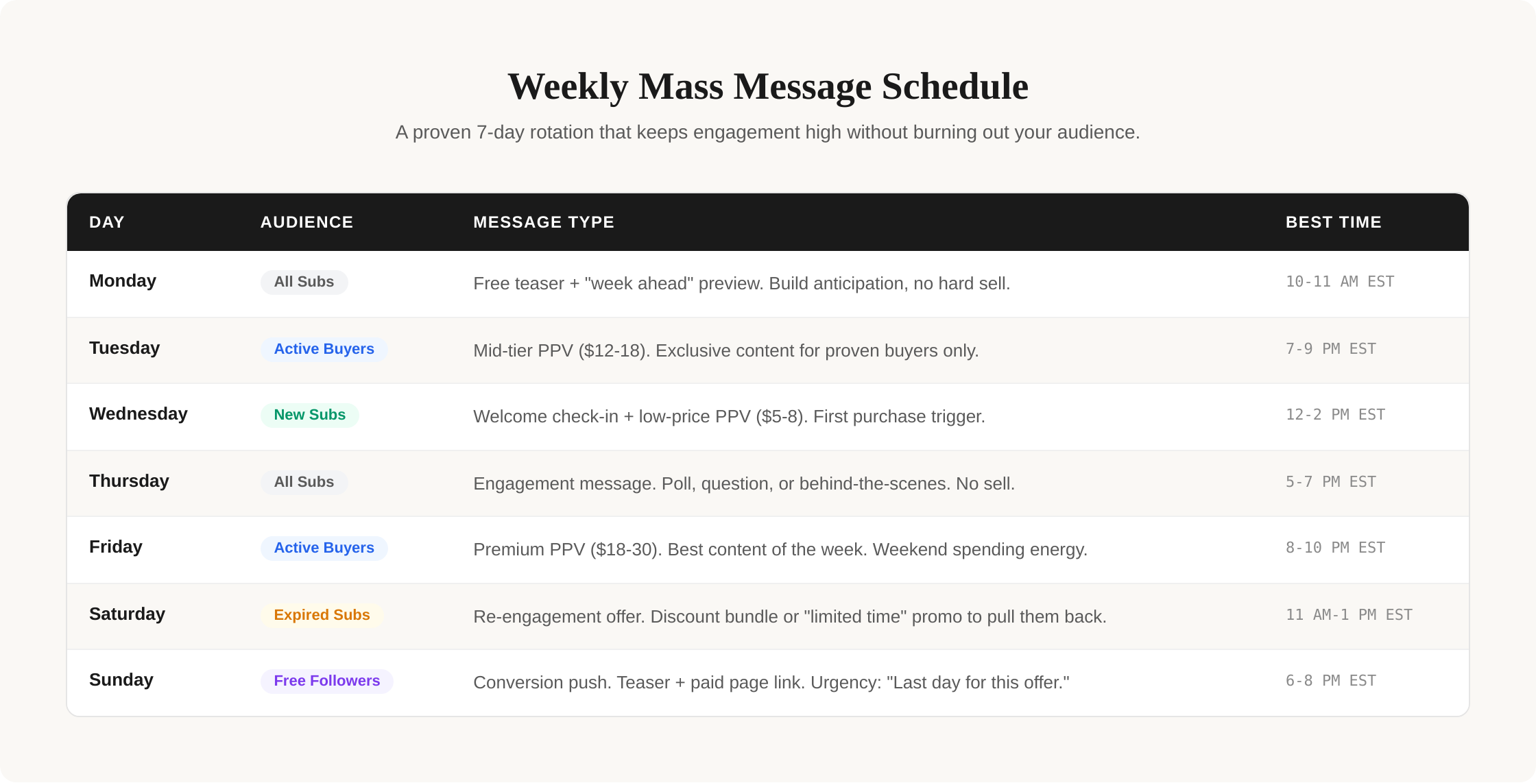 That shakes out to 3 PPV sends and 4 free messages per week. Roughly 43/57 weighted toward engagement. You don't need to follow this template to the letter. the point is having a system instead of waking up every day and going "uh... what should I send today?"