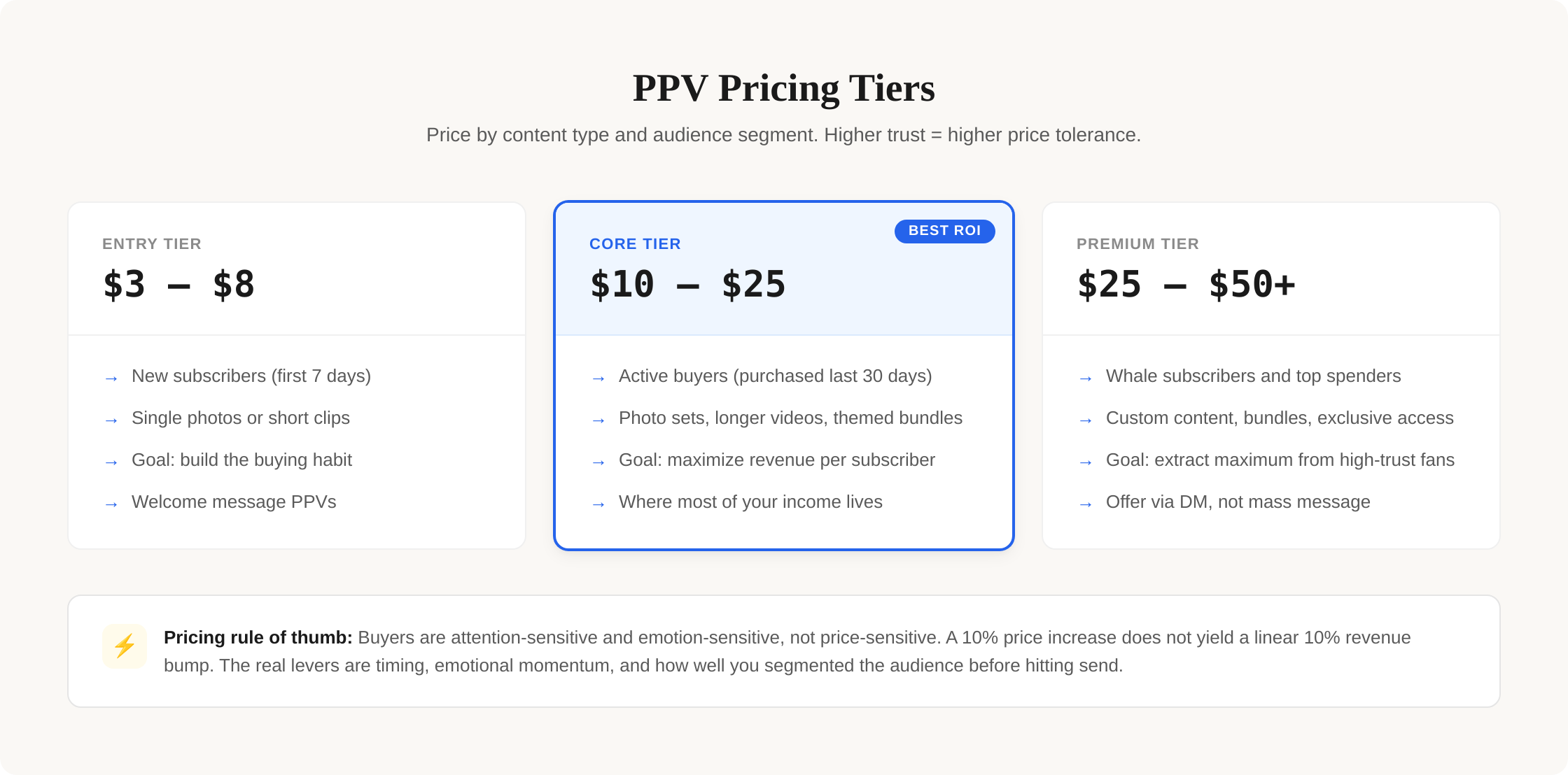 One thing that trips creators up constantly: price by effort, not by duration. A 30-second clip from a professional shoot can absolutely justify $15-20. Meanwhile a 5-minute phone video shot in bad lighting might only be worth $8-10. Fans are paying for quality and exclusivity. They don't care how many minutes it is.